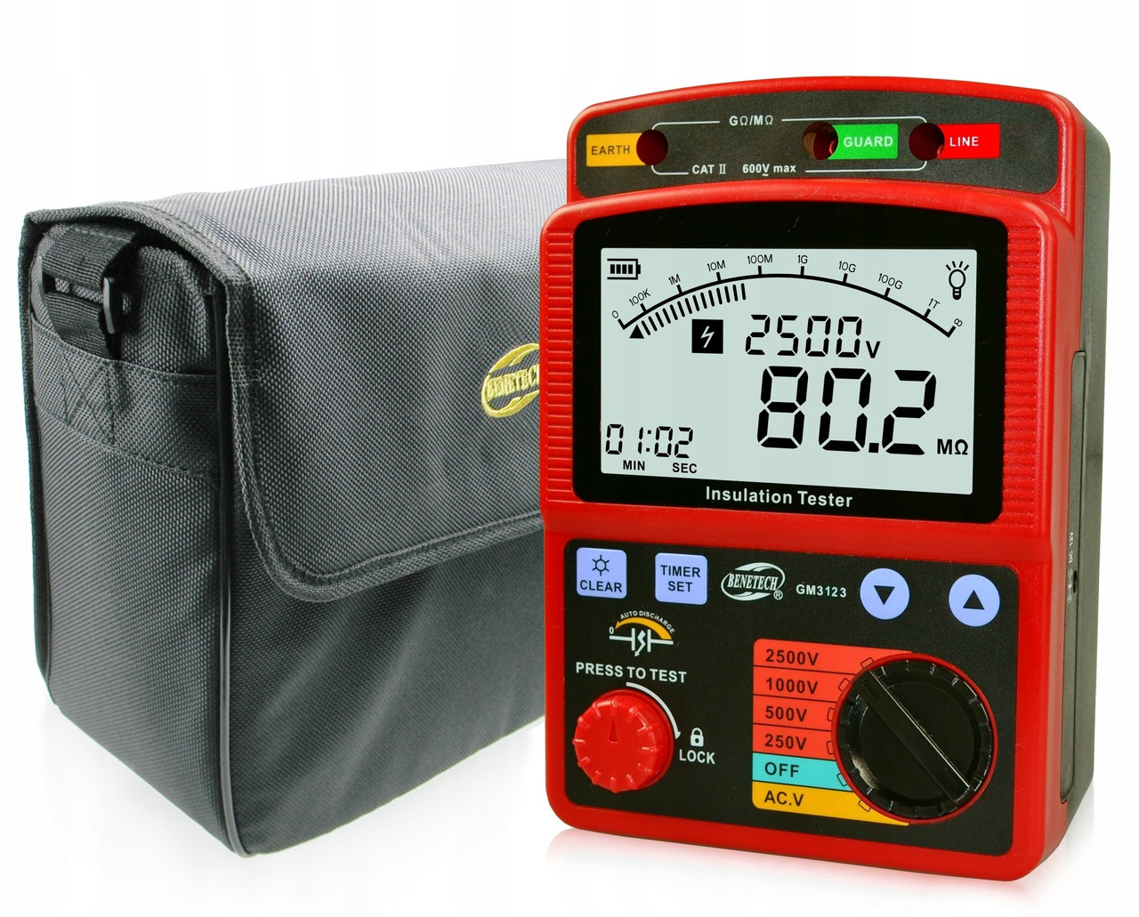 BENETECH GM3123 — професійний мегомметр, призначений для вимірювання міцності ізоляції при високій напрузі. Пристрій дозволяє проводити тестування між струмопровідними елементами кола та ізоляцією — такими як оболонки кабелів, корпуси електрообладнання, розподільчі щити та інші компоненти, що захищають користувача від ураження струмом.