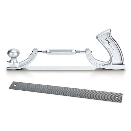 Рубанок кузовщика з регулюванням радіуса кривизни TOPTUL JGAE0205 використовується для зачищення поверхні кузова автомобіля або будь-якої іншої великої поверхні. Інструмент виготовлений з алюмінієвого сплаву і оснащений двома рукоятками. Завдяки можливості регулювання радіусу згину полотна рубанок можна використовувати на складних вигнутих поверхнях.