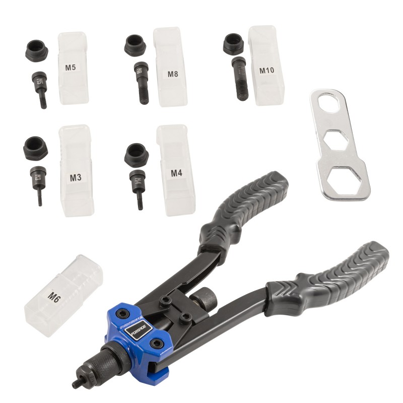 Заклепочник ручний Forsage F-67804 для різьбових заклепок призначений для створення нероз’ємних різьбових з’єднань. Заклепки з алюмінію, сталі (М3, М4, М5, М6, М8, М10) дозволяють міцно зафіксувати листові заготовки, металевий профіль та легкі конструкції. Для кожного типорозміру передбачено відповідну головку. Заклепочник застосовується для будівельних, монтажних робіт, буде корисним удома, в гаражі або на дачі. ПеревагиЛитий корпус забезпечує стійкість до навантажень та довговічність інструменту.Регулювальний гвинт із контргайкою дозволяє налаштувати величину ходу для надійної установки заклепок.Ергономічні ручки знижують втому при тривалій роботі.Рукоятки виготовлені з термопластичної гуми PAHs Free, що не містить токсичних поліароматичних вуглеводнів.Отримані за допомогою заклепочника конструкції допускають встановлення відповідних гвинтів для підвішування різних конструкцій.У комплекті є ключ для швидкого встановлення насадок.